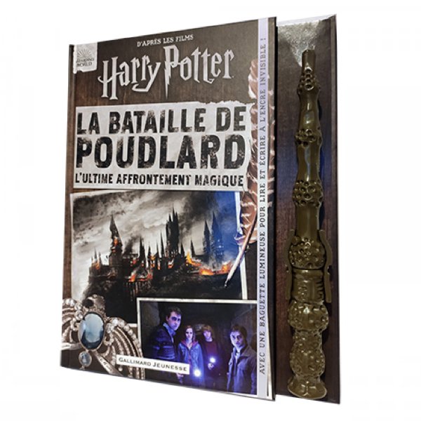 Dans la même série que La carte du Maraudeur, ce livre fascinant avec rabats dévoile de nombreux secrets sur l’origine et le déroulement de la mythique bataille de Poudlard. La baguette lumineuse qui l’accompagne permet de lire ou d’écrire à l’encre invisible, et de dessiner un masque de Mangemort, retrouver les Patronus des personnages, découvrir les noms des membres de l’armée de Dumbledore ou faire apparaître les détails cachés des sortilèges utilisés dans les films Harry Potter.