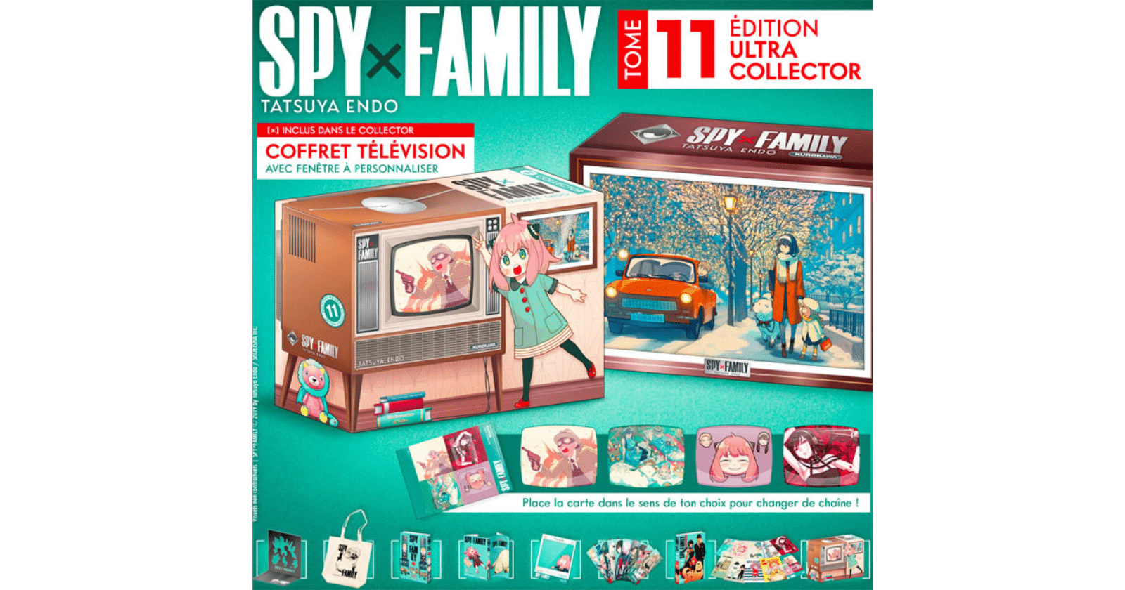 Cette version ultra collector contient : le tome 11, le roman Spy x Family (disponible en avant-première), 1 serre livre, 1 tote-bag, 10 marque-pages, 1 Anyagram, 10 cartes postales, le tout dans un coffret sur-mesure aux couleurs de la série !