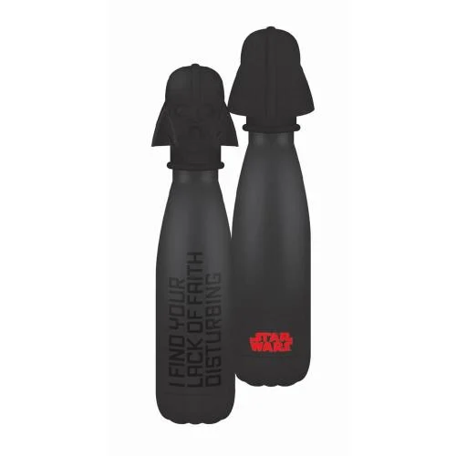 La bouteille est dotée d'un couvercle à vis en 3D pour un accès facile, moulé et conçu pour ressembler à l'emblématique Dark Vador. Sur le devant, on peut lire la phrase "Je trouve votre manque de foi inquiétant", tandis que le verso porte le logo de Star Wars.